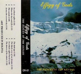 En los 90s la escena estaba conformada sobretodo por bandas de heavy y thrash, el death se expandía e iniciando el 1995 se forma Effigy of Gods, con el interés de explorar lo más oscuro de la época, como el black y el doom. A su líder Rodrigo Kaver Velasco en la guitarra, se unieron Juan Carlos Valdivia en el bajo, Victor Soria (Kult of Moloch, Infested Soul, ex- Metástasys, Undead) en las voces y Amilcar Bohorquez (Astharoth) en la batería. Estos dos últimos, poco después abandonan la banda e ingresan Marcelo Trigo (ex Lilith) y en las voces, Edwin Álvarez (Die with you). En 1995 lanzan su demo ensayo The Black Cover of Our Dreams, con composiciones y covers de Hipocrisy, Amorphis y Tiamat. Ese mismo año Edwin se retiró e ingresó Christopher Fletcher (Lilith, ex Nordic Wolf) para junto a la banda ingresar al estudio Isla del Sonido a cargo de Carlos Huancaña a grabar su demo The Dances of the Extasis que fue producido por el sello Catapult Records de Jhonny Calle y lanzado un año después. Este trabajo incluye clásicos temas como In a Black Coffin, Where the Lost Souls Fly, The Dark Age. Puedes escuchar el álbum completo aquí.