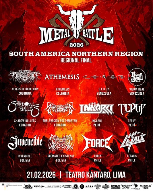 Después de cinco meses de iniciar la convocatoria con más de dos centenas de bandas inscritas, llega la batalla definitiva del Metal Battle de la denominada Región Norte de Sudamérica. Seis países: Bolivia, Chile, Colombia, Ecuador, Perú y Venezuela; cada uno con dos bandas, luchando para ganar un espacio de representar a la región en la Final de Metal Battle en Alemania y ser parte del W:O:A 2026. La cita es este este sábado 21 de febrero en el Teatro Kantaro (capacidad 600 personas) de la ciudad de Lima desde las 11 de la mañana y la entrada es gratuita.
